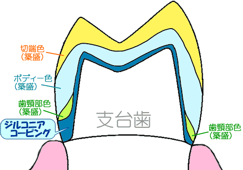 内側がジルコニア、外側が陶材の被せ物はこの図のような構造になっているため、天然歯に近い色調を再現することができます。