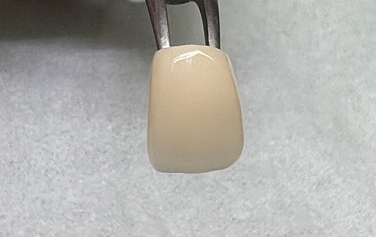 これは内側はジルコニア、外側は陶材の2種類で作られています。透明感のある陶材を歯科技工士がひと筆ずつ盛って、天然歯に近い色調に仕上げるため、オールセラミックの被せ物のなかでも、もっとも審美性が高いです。また、内側のジルコニアによって歯の土台の色をカバーすることができます。陶材を盛るため、技工士さんの洗練された技術が必要とされます。世に言う、日本の技工士による巧みの技術の最高傑作となります。しかしながら、この材料は厚みが必要となるため担当医とよく相談して決めて下さいませ。