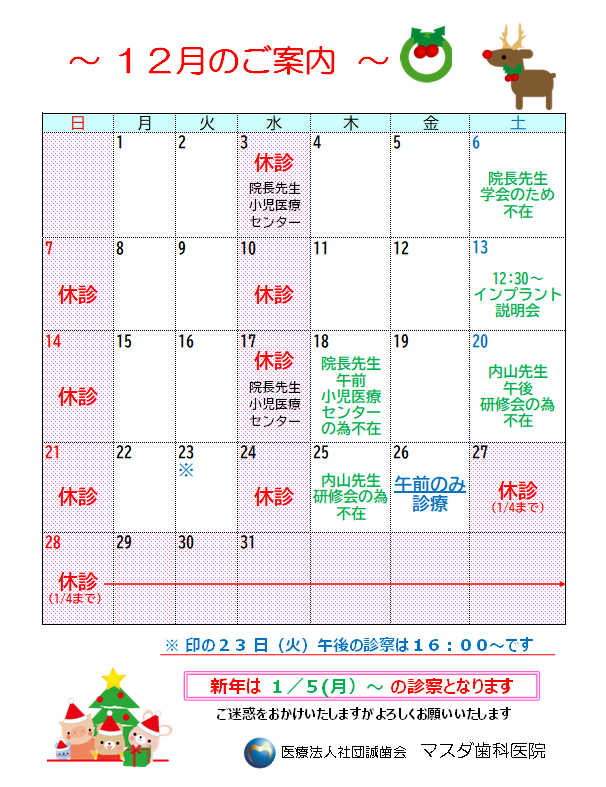 さて、12月の診療予定のご案内です。