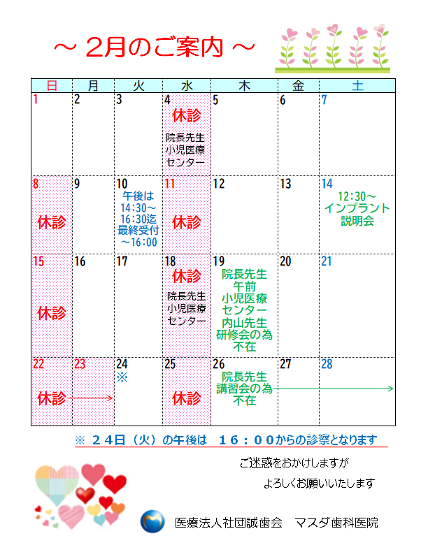 こんにちは。 さいたま市 東大宮駅すぐの歯医者 マスダ歯科医院です。 第102回インプラント説明会を2026年2月14日(土)12:30~開催いたします。 ご興味のある方にはインプラントをやる、やらないにかかわらずお気楽 […]